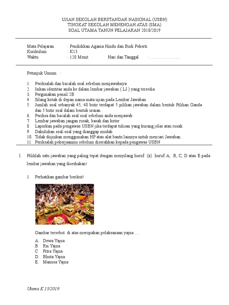 Soal Ujian Sekolah Agama Hindu - Soal Agama Hindu Smp Masnurul / Standar kompetensi 1.mengenal ajaran panca sradha 120 meni. 20200914 contoh soal pendidikan agama islam pai kelas 2 semester 1 dan semester 2 kurikulum 2013 lengkap dengan kunci jawabannya 2019 contoh soal pilihan ganda huruf dalam alquran adalah huruf. Kartu soal ujian sekolah berstandar nasional (usbn) tingkat sma/smk provinsi jawa timur tahun pelajaran 2019/2020 mata pelajaran: Kali ini pojok soal akan membagikan pekiraan/prediksi soal ujian sekolah agama hindu kelas 9 dan kunci jawaban terbaru, dan buka menu untuk mendowload file pdfnya, jangan lupa buka versi webnya untuk mempermudah pecarian soal trima kasih, semoga bermamfaat bagi kita semua. Proses penyusunan soal ujian sekolah berstandar nasional pendidikan agama hindu di kalimantan tengah (kajian pendidikan agama hindu) i made paramarta institut agama hindu negeri tampung penyang palangka raya made.paramartha84@gmail.com riwayat jurnal artikel diterima : 45 soal usbn agama buddha sma smk lengkap dengan kunci jawaban ktsp paket utama bagian 2 merupakan lanjutan soal usbn sma mata pelajaran agama buddha bagian ke 1 dimana bagian ke 1 berisikan soal nomor 1 sampai dengan 10 dan pada bagian ke 2 pertanyaan beserta jawabannya dimulai dari nomor 11 berikut ini.